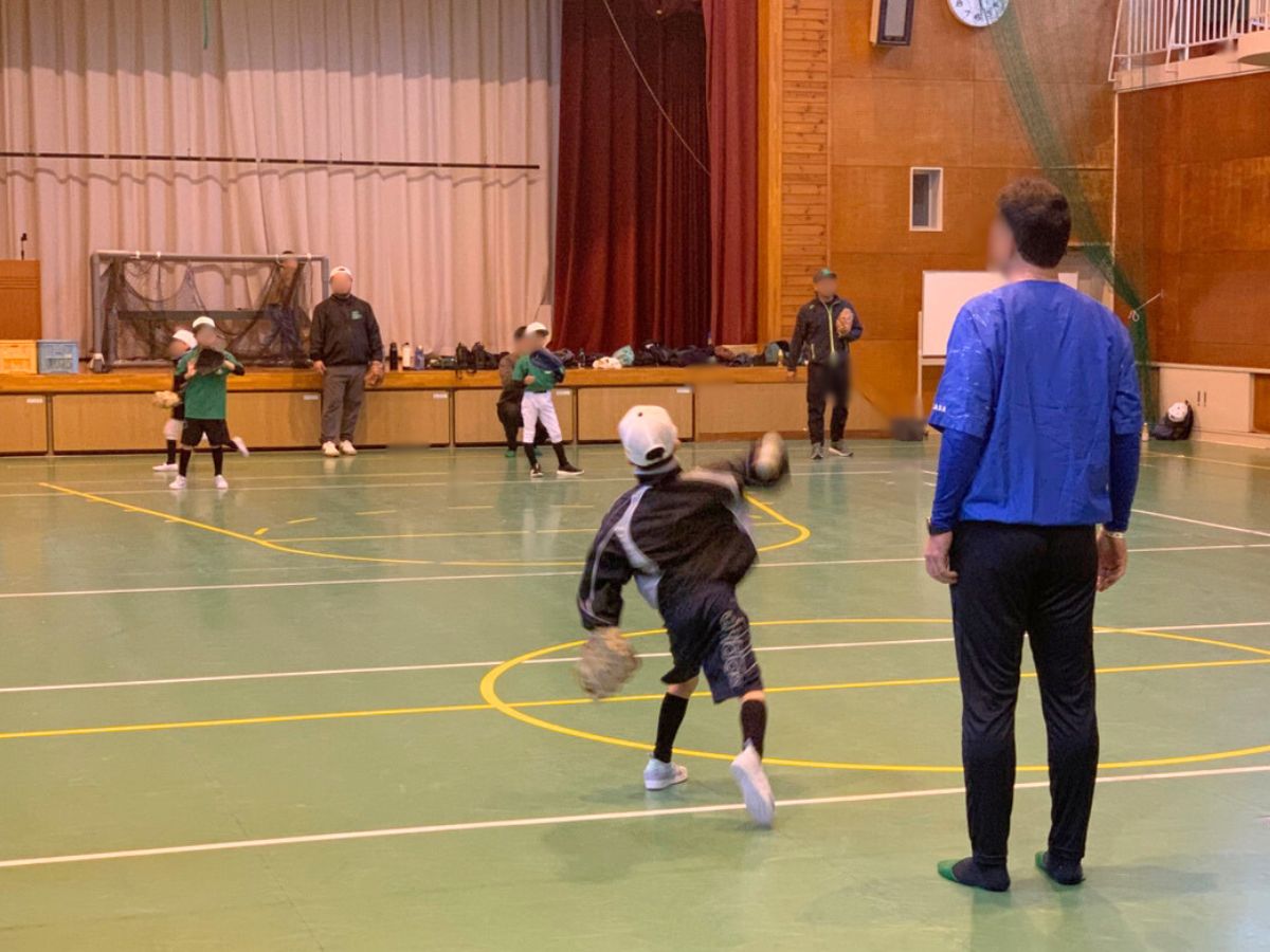 この日の午前中は、雨天のため体育館で小学校低学年の生徒を対象に行いました! 午後からは登茂山球場の屋内練習場へ移動し、高学年を対象とした教室を開催。